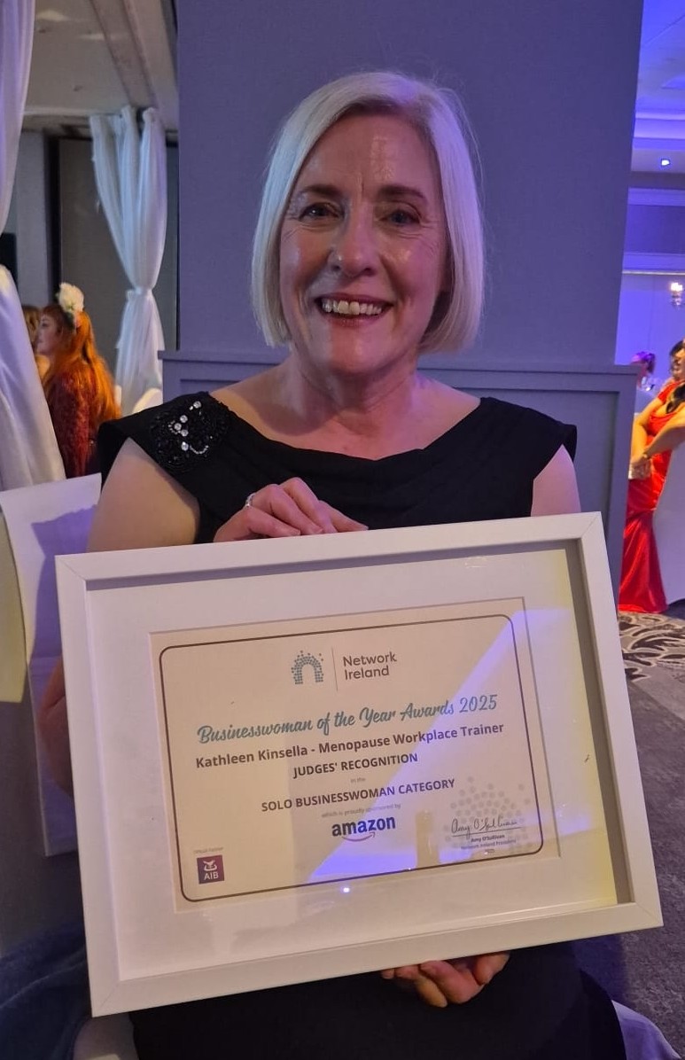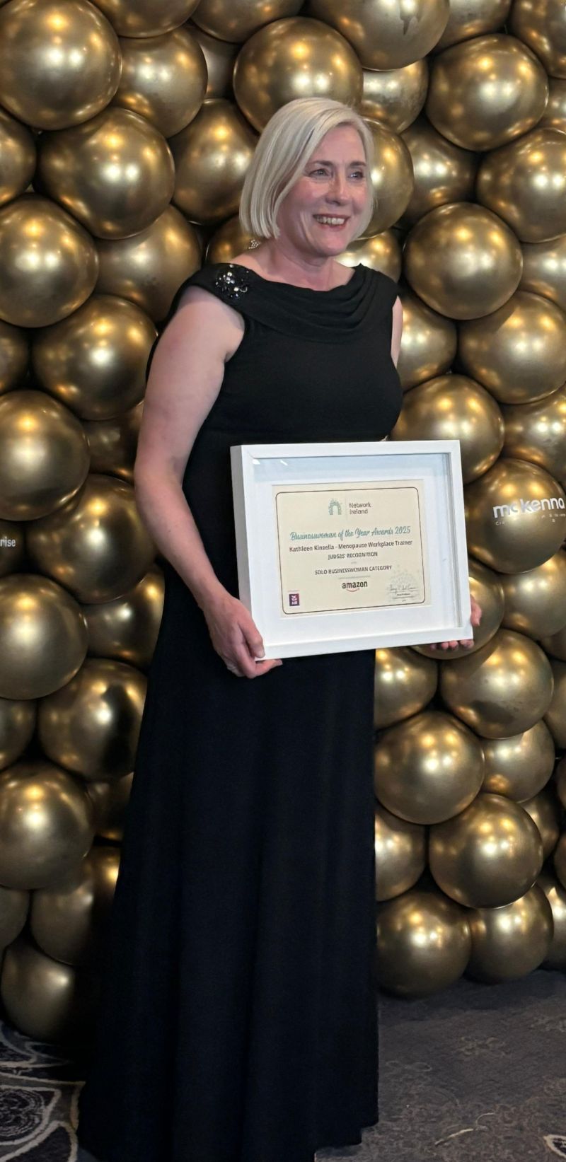 A few months later, I had the privilege of representing the Wexford branch at the National Business Awards. Standing there among so many inspiring women, I was incredibly humbled to receive the Judges’ Recognition Award in the Solo Businesswoman category for my work as a Menopause in the Workplace awareness trainer. I’m still so proud — and honestly a little overwhelmed — to have my work recognised in this way.